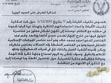 حصل "اليوم السابع" على مستندات تكشف مخطط وزير الداخلية السابق حبيب العادلى لتفجير كنيسة القديسين بالإسكندرية، وهو تكليف القيادة رقم 77 بتاريخ 2 ديسمبر 2010 حول بحث إمكانية تكتيف الأقباط وإخماد احتـجاجاتهم المتتالية وتهدئة نبرة البابا شنودة فى خطابه مع النظام.