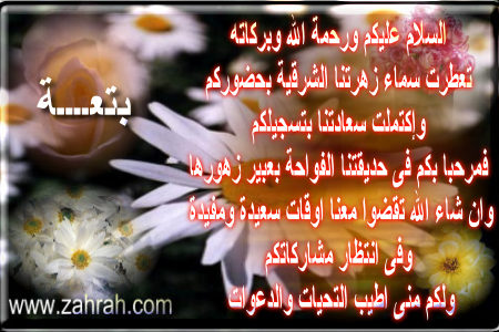 ها هو الكلام : السلام عليكم ورحمة الله وبركاته تعطرت سماء زهرتنا الشرقية بحضوركم وإكتملت سعادتنا بتسجيلكم فمرحبا بكم فى حديقتنا الفواحة بعبير زهورها وان شاء الله تقضوا معنا اوقات سعيدة ومفيدة وفى انتظار مشاركاتكم ولكم منى اطيب التحيات والدعوات ^ ^ بارك الله فيك اخي الاكحل وأثابك الجنة آمين ![]()