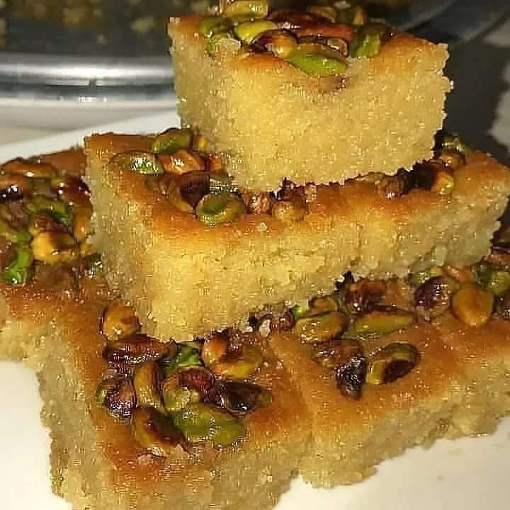 ادهني صينية الفرن الصغيرة بالسمنة، ثم افردي فيها خليط السميد، ثم ادهني وجه السميد بالسمنة، ورشّي عليه المكسرات.